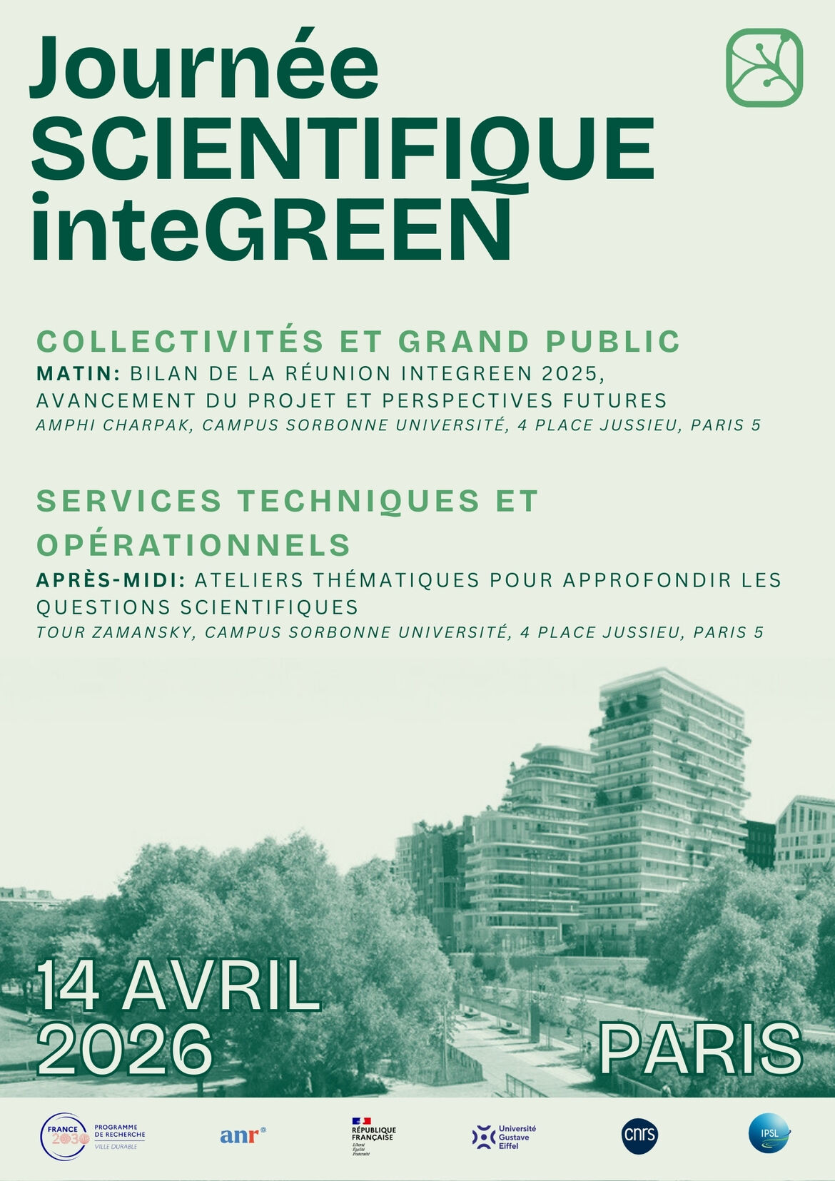 Nous avons le plaisir de vous informer de la tenue de la journée scientifique annuelle inteGREEN, qui se déroulera le mardi 14 avril 2026, sur le campus de Jussieu de Sorbonne Université (4 place Jussieu, Paris 5ᵉ). Cet événement réunira tous les acteurs du projet inteGREEN (personnels des laboratoires de recherche, directions et services techniques des collectivités, experts des agences et structures privées).